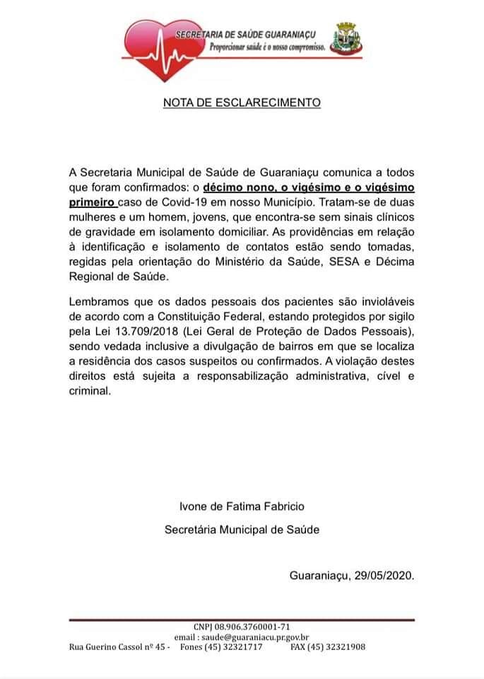 A secretaria de Saúde de Guaraniaçu confirmou na noite de hoje (29) mais três casos de coronavírus.