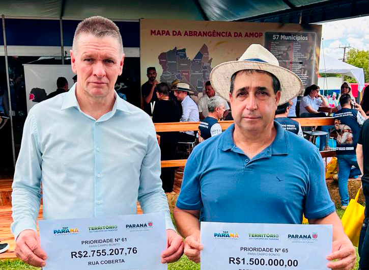 O município de Campo Bonito garantiu mais de R$ 4,2 milhões em recursos para obras de infraestrutura urbana. A liberação dos convênios ocorreu durante o Show Rural, em encontro realizado no estande da Associação dos Municípios do Oeste do Paraná, que reuniu o prefeito Mário Weber, o vice-prefeito Aparício Piana e autoridades estaduais, entre elas o secretário Paranhos.