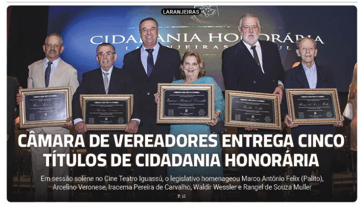 Câmara entrega título de Cidadania Honorária a cinco personalidades de Laranjeiras