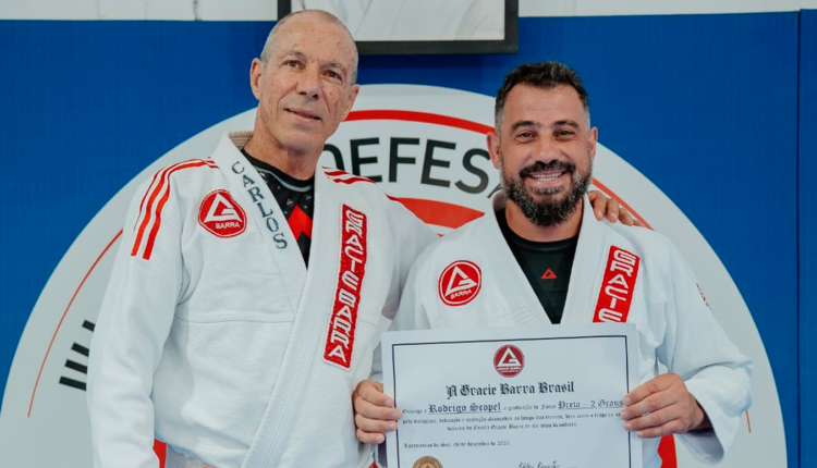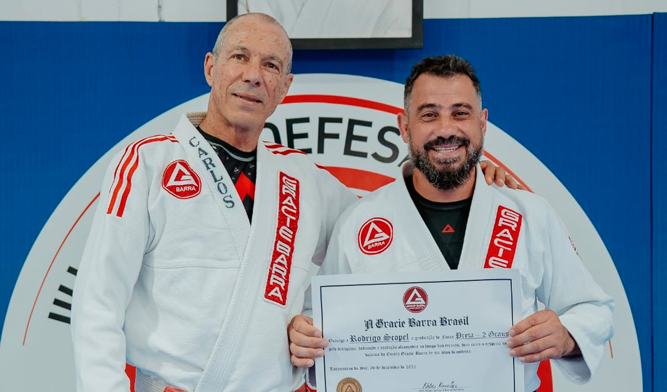 Nos dias 05 e 06 de dezembro, o professor Rodrigo Scopel, da Gracie Barra local, esteve em Florianópolis para participar de seminários e cerimônias de graduação. Durante o evento, ele recebeu o segundo grau na faixa preta, concedido pelo Mestre Carlos Gracie Jr., fundador da Gracie Barra e uma das figuras mais influentes do jiu-jitsu mundial. Carlos Gracie Jr. é filho do Grande Mestre Carlos Gracie, reconhecido como um dos principais nomes da história do jiu-jitsu brasileiro.