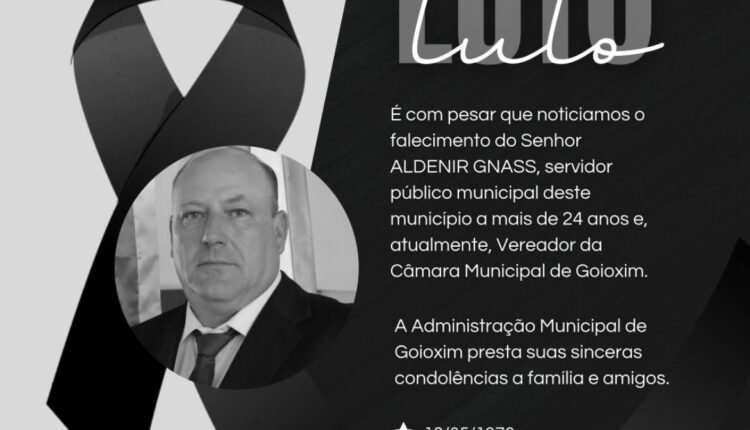 A prefeitura de Goioxim comunicou, com pesar, o falecimento de Aldenir Gnass, servidor público com mais de 24 anos de atuação no município e, atualmente, vereador da Câmara. O corpo foi localizado nesta sexta-feira (27) na comunidade de Pinhalzinho, área rural do município. Informações preliminares indicam que a causa da morte teria sido suicídio. A Administração de Goioxim manifesta condolências à família e aos amigos.