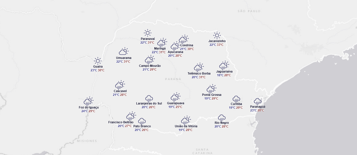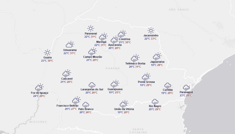 Após dias seguidos de calor intenso com temperaturas acima da média em várias regiões do Paraná, um padrão de tempo mais instável vem ganhando espaço no fim de dezembro, com chuva prevista para várias áreas do estado e perspectiva de alívio térmico nos próximos dias. O cenário é monitorado pelo Sistema de Tecnologia e Monitoramento Ambiental do Paraná (Simepar), que aponta pancadas de chuva e queda dos termômetros após sequência de calor e alta umidade.