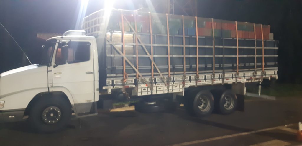 Na segunda ação, durante atividades de rotina, a equipe de serviço em Ubiratã, abordou um caminhão MB/L1418 E, de Maringá, conduzido por um homem de 27 anos, morador de Maringá. Durante a vistoria, foram localizadas diversas caixas de cigarros contrabandeados escondidos sob caixas de frutas vazias. O condutor foi preso e encaminhado juntamente com a carga para a Polícia Federal de Cascavel para os procedimentos legais cabíveis.