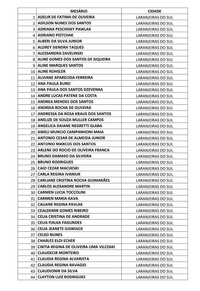 O Fórum Eleitoral de Laranjeiras do SUl divulgou uma relação com 248 nomes. Estes são os convocados para atuarem nas eleições municipais, em 15 de novembro, em Laranjeiras do Sul.
