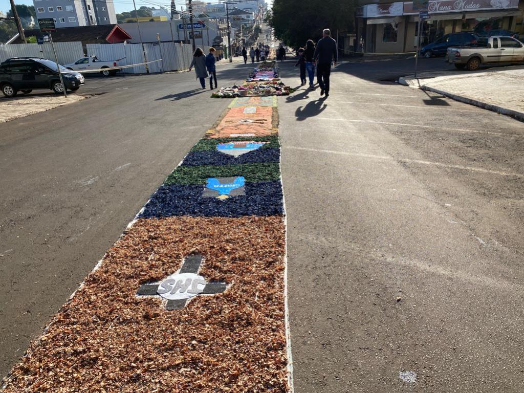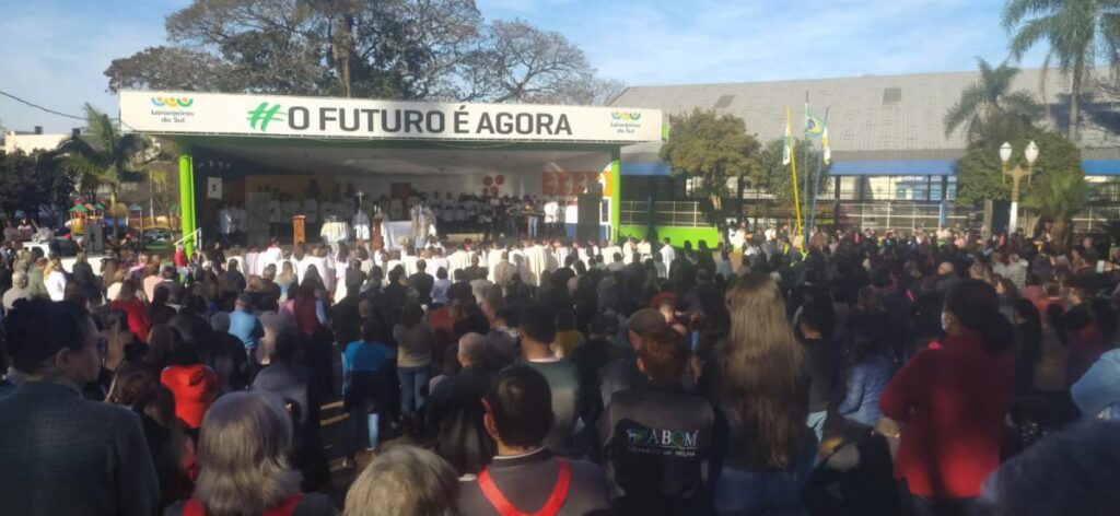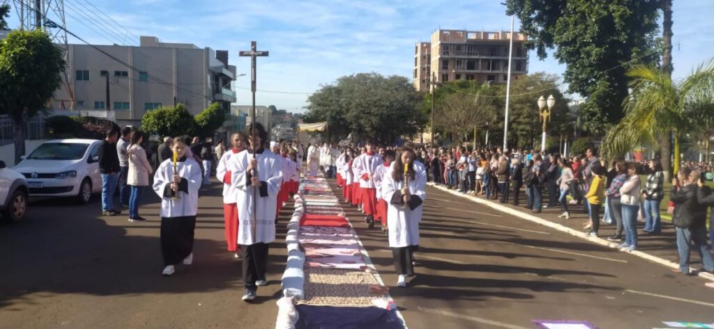 Aconteceu nesta quinta-feira (16), em Laranjeiras do Sul a celebração de Corpus Christi que está ligada à Igreja Católica e celebra o Santíssimo Sacramento da Eucaristia, uma homenagem ao sacrifício de Jesus Cristo feito por toda a humanidade; representação e celebração do seu corpo e sangue.