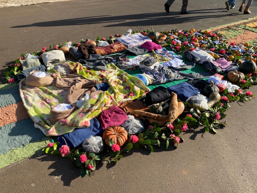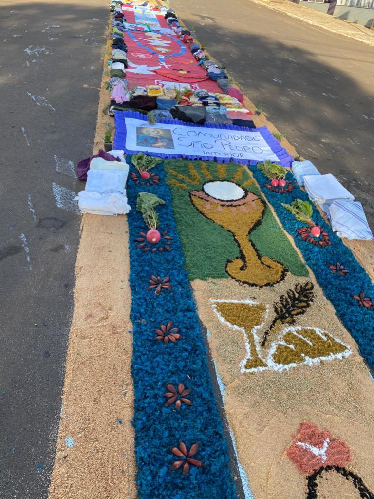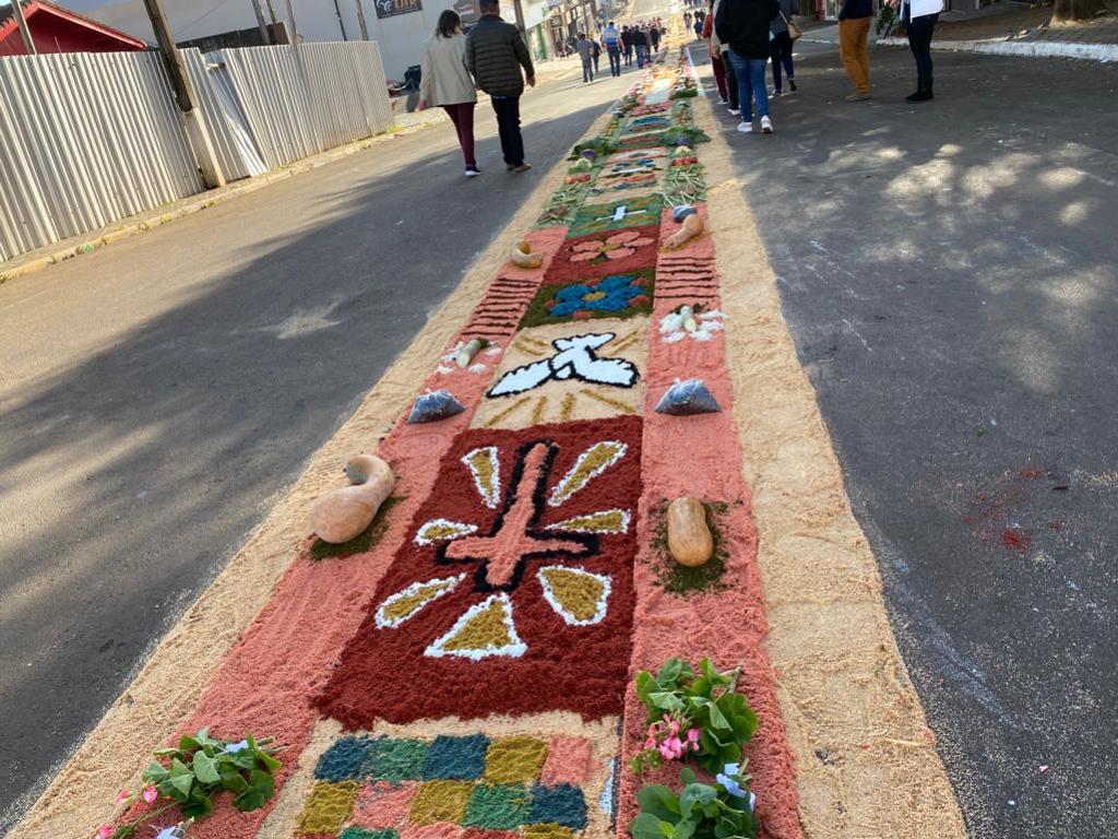 A missa foi conduzida pelo pároco da Matriz Santana, padre Sebastião. Desde a madrugada desta quinta-feira (16), dezenas de seguidores confeccionram o tradicional tapete com serragens, maravalhas, pedras, areia e farinha. Além disso várias peças de roupas, calçados e alimentos fizeram parte da decoração.