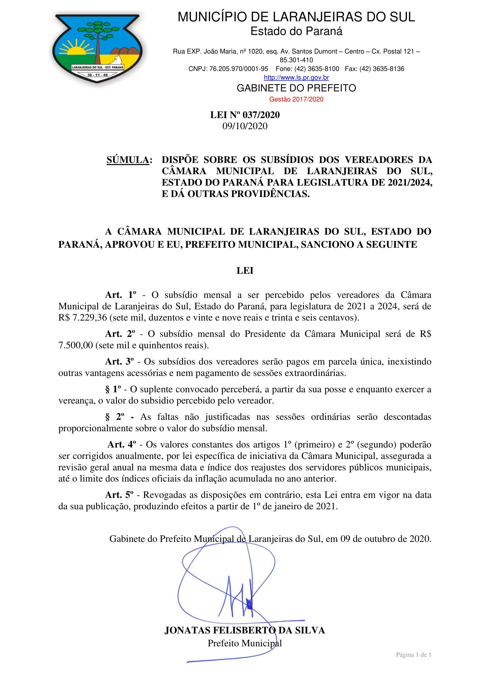 Foram publicadas na edição de hoje (10) no Diário Oficial da prefeitura de Laranjeiras do Sul – Correio do Povo do Paraná – as leis 37/2020 e 38/2020 que aumenta os subsídios do prefeito, vice-prefeito, secretários municipais, vereadores e presidente da Câmara de Laranjeiras do Sul para a gestão 2021-2014.