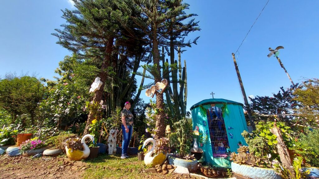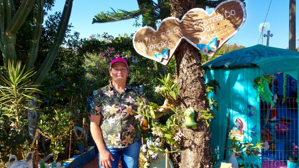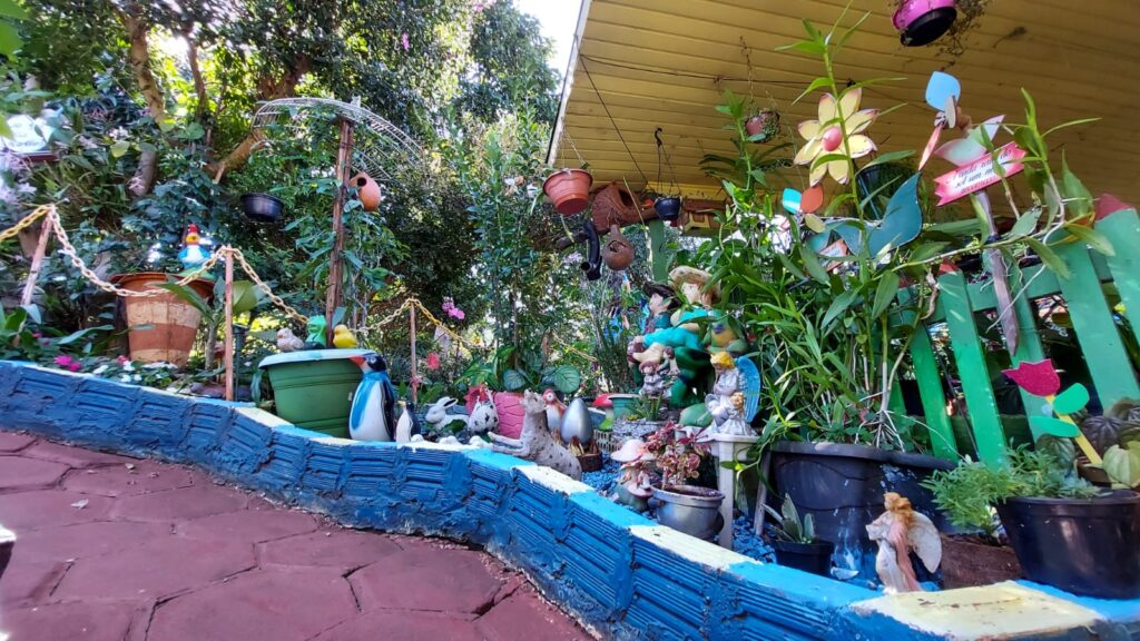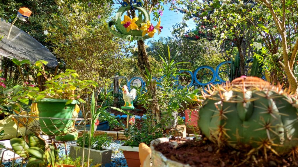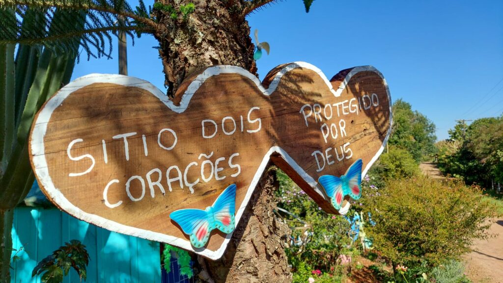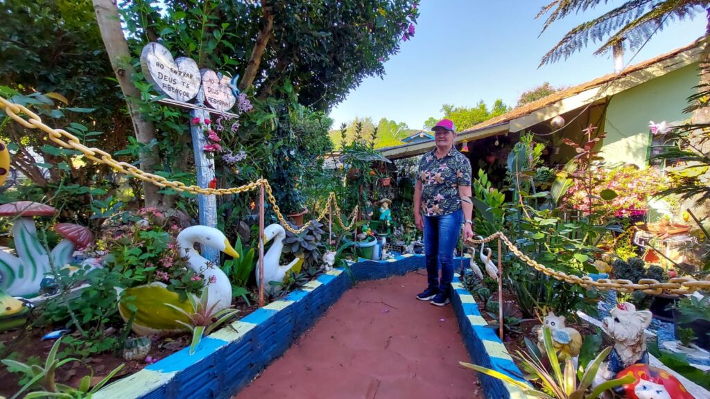 A entrada é ladeada por dois altos pinheiros, com uma placa onde se lê: ‘Sítio Dois Corações, Protegido por Deus’, seguida pela calçada pintada de vermelho em contraste com tijolos azuis e amarelos. Repleto de animais e figuras em miniatura, o jardim conta com artesanatos feitos de materiais recicláveis, espalhados entre uma grande variedade de plantas e flores.