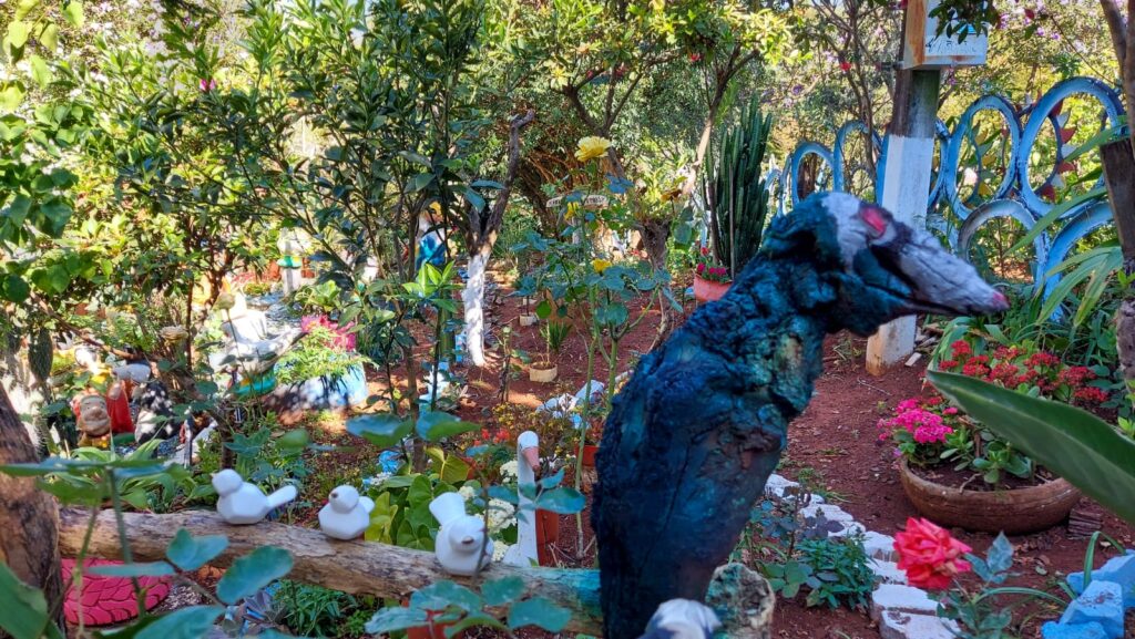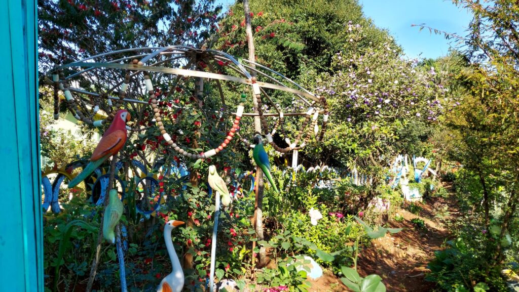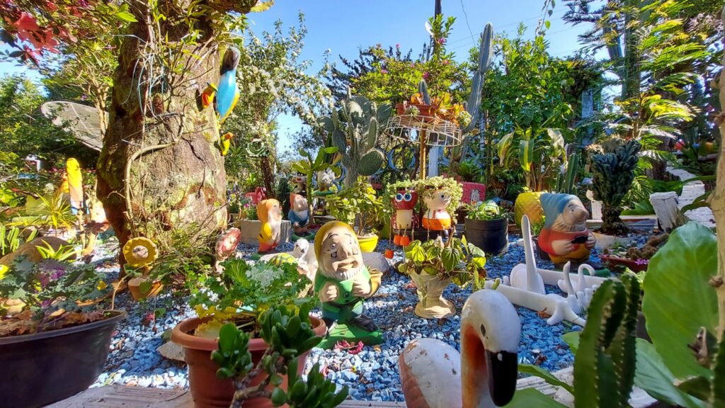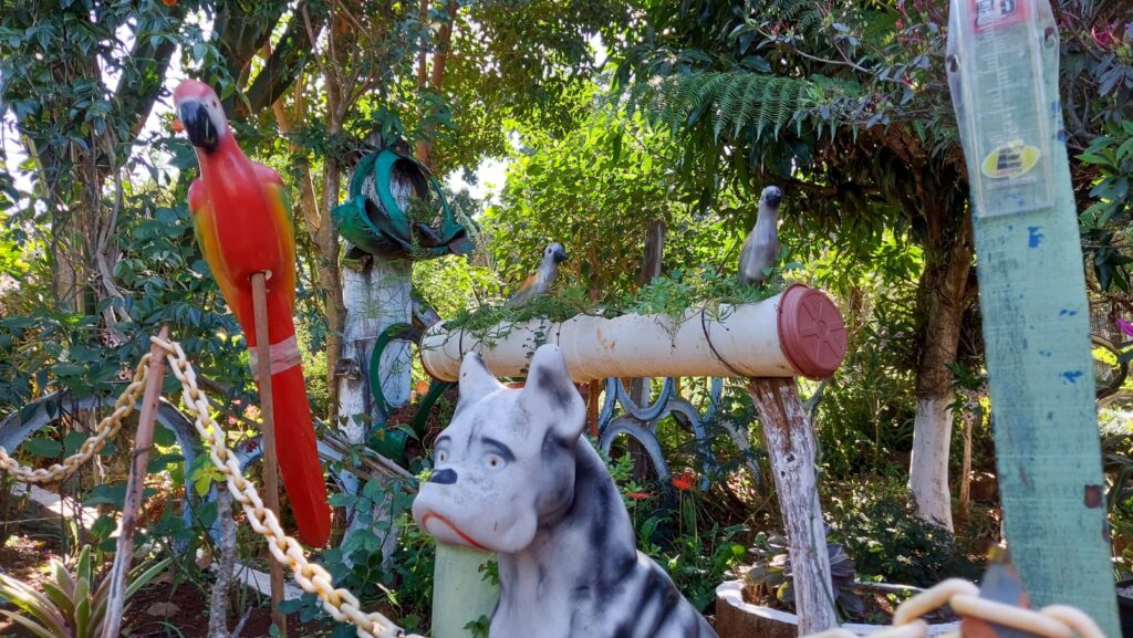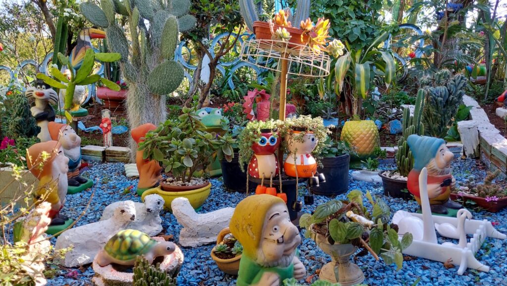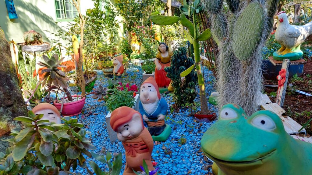 A entrada é ladeada por dois altos pinheiros, com uma placa onde se lê: ‘Sítio Dois Corações, Protegido por Deus’, seguida pela calçada pintada de vermelho em contraste com tijolos azuis e amarelos. Repleto de animais e figuras em miniatura, o jardim conta com artesanatos feitos de materiais recicláveis, espalhados entre uma grande variedade de plantas e flores.