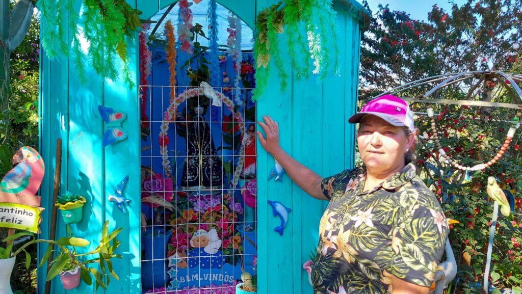 Irene é aposentada, e faz bico como diarista para complementar a renda. Há 17 anos ela começou a enfeitar o quintal de sua casa. “Fui montando aos poucos. Quando acho alguma coisa útil, trago para casa e coloco no jardim. Cuido dele aos sábados e domingos”, conta Irene.