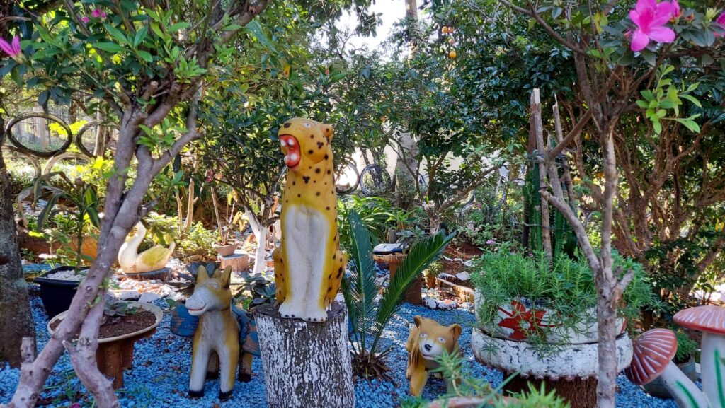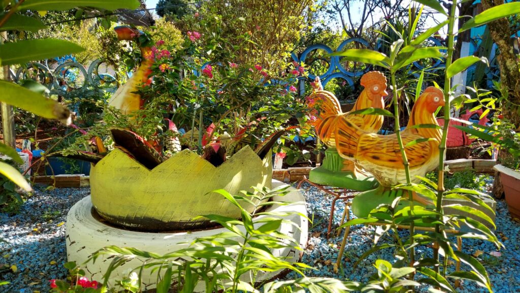 Irene não tem gastos com o jardim. Fora os animais e figuras, que são comprados, o resto é composto por objetos reutilizados.