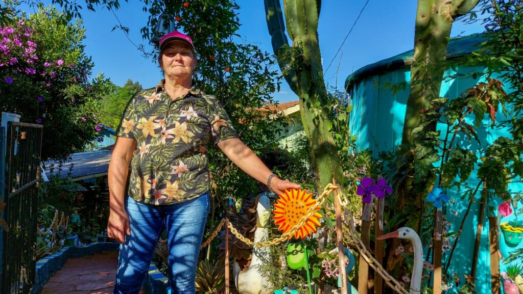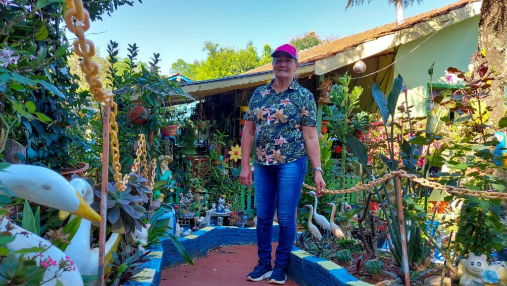 Irene Zocche é dona de um jardim criado com materiais reciclados na Vila Rural. “Tenho prazer no que faço. Para mim, cuidar do jardim é uma terapia”, relata; Confira as fotos