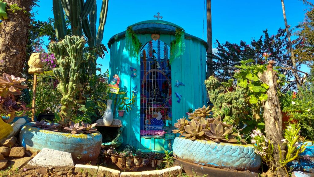O que mais se destaca, à primeira vista, é a capela de madeira, tingida de azul e coberta por uma antena parabólica, abrigando a imagem de Nossa Senhora Aparecida e do Sagrado Coração de Jesus.