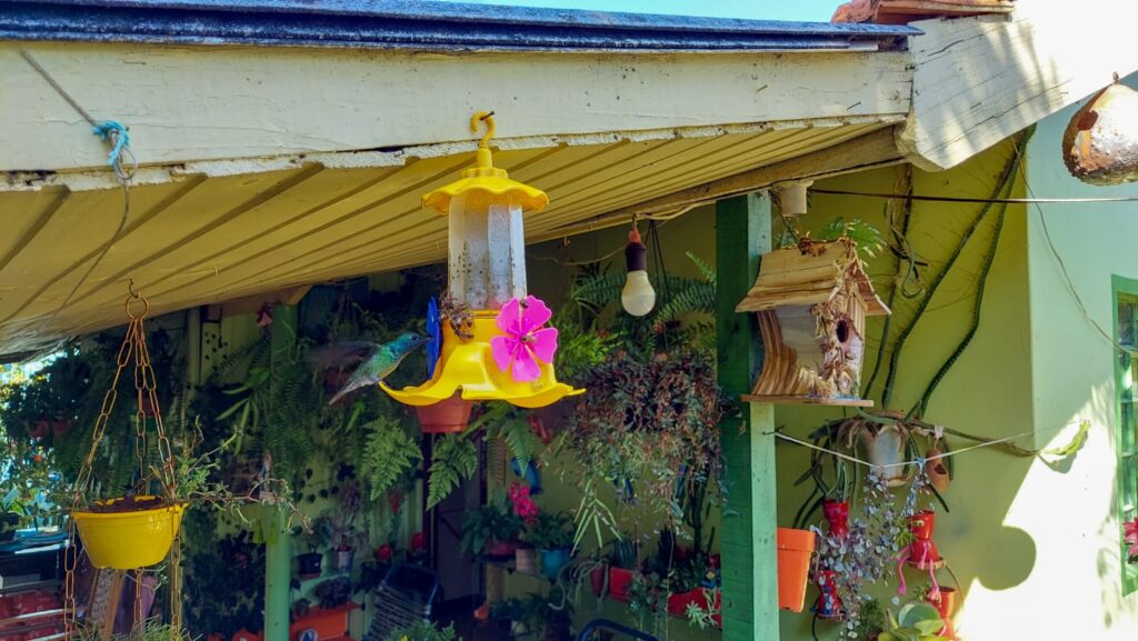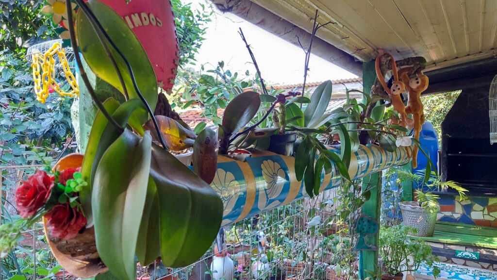 Para ela, todo objeto pode ter alguma utilidade e seu jardim é prova disso: um cabideiro, uma mangueira e um expositor de supermercado suportam os ramos de uma planta; bacias, cones de trânsito, canos de PVC, pneus recortados e pintados servem como vasos de flores.