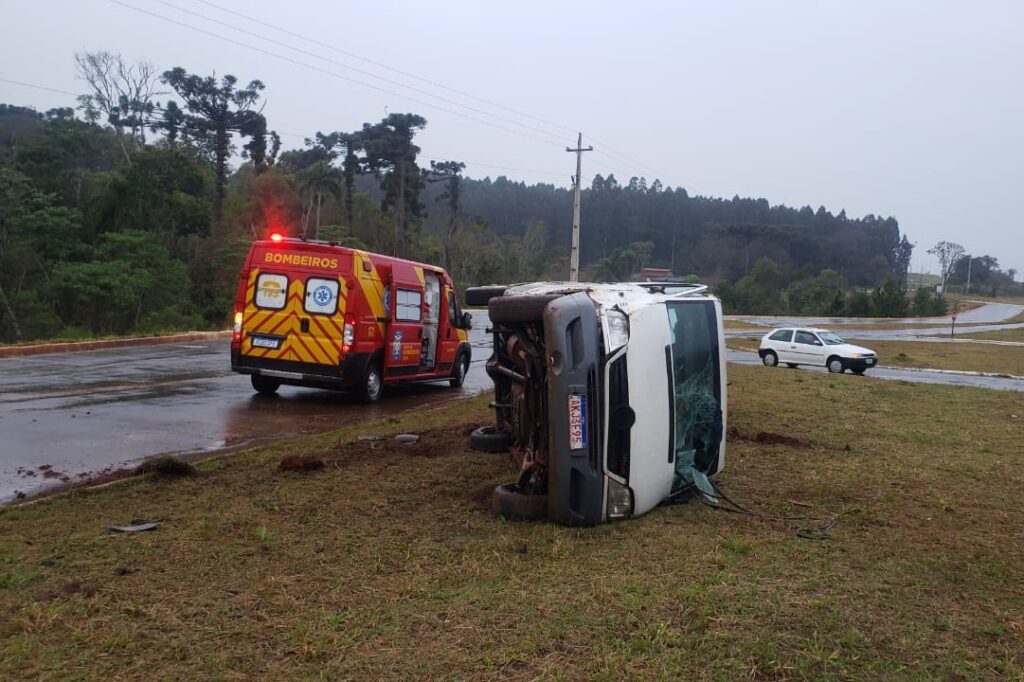 Informações preliminares afirmam que a van seguia de Rio Bonito do Iguaçu para Cascavel derrapou na pista molhada ocasionando a perda do controle do veículo pelo motorista, que acabou tombando.