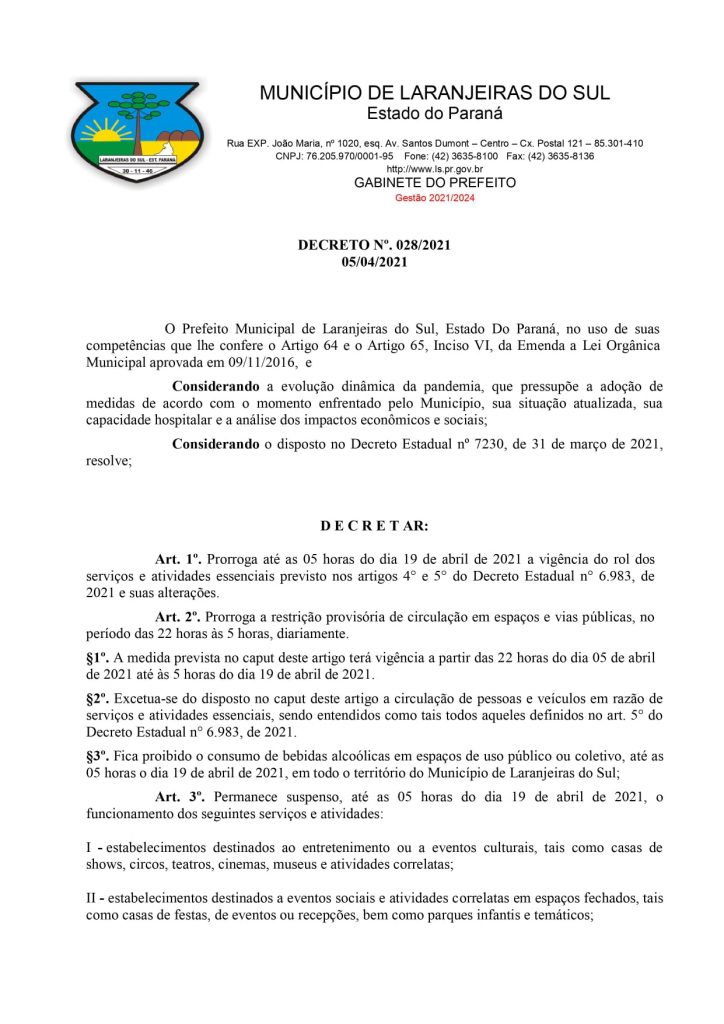 O novo decreto 028-2021, que será valido a partir das 18h de hoje (5), flexibilizou o horário de funcionamento do comercio em Laranjeiras do Sul. A partir de agora os estabelecimentos podem ficar abertos até as 22h e depois disso ocorrerá o toque de recolher. A regra também vale para os sábados, excetuado pelo consumo no local. Ainda, restaurantes e farmácias podem continuar trabalhando com deliverys após esse horário, assim como todos os serviços essenciais.