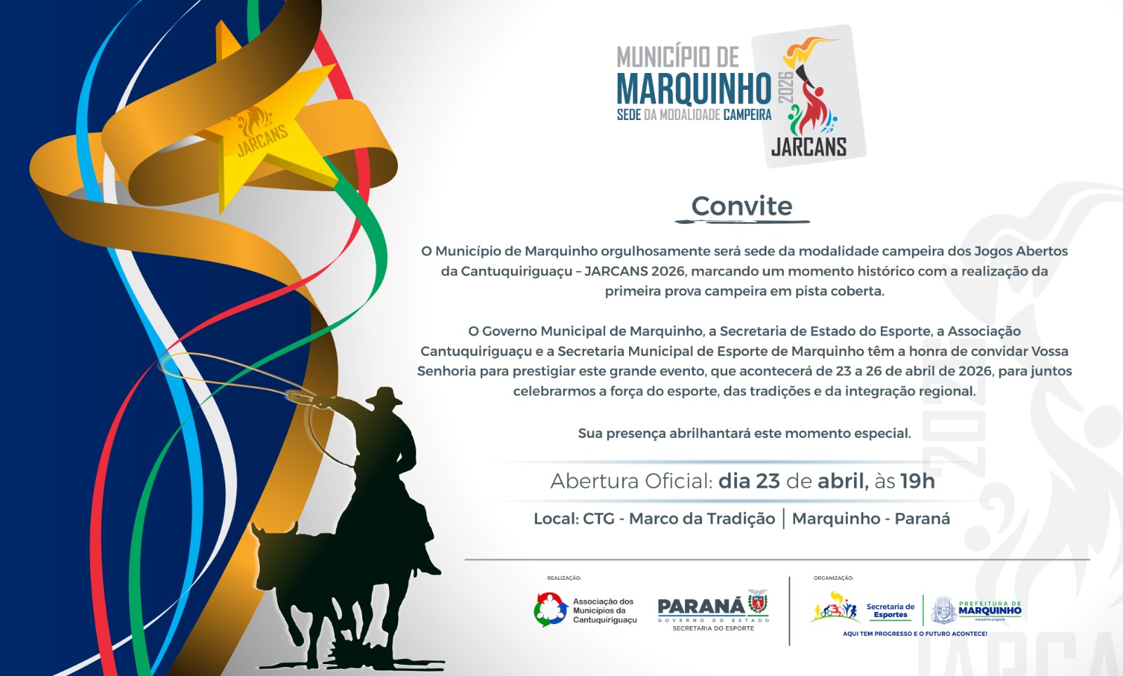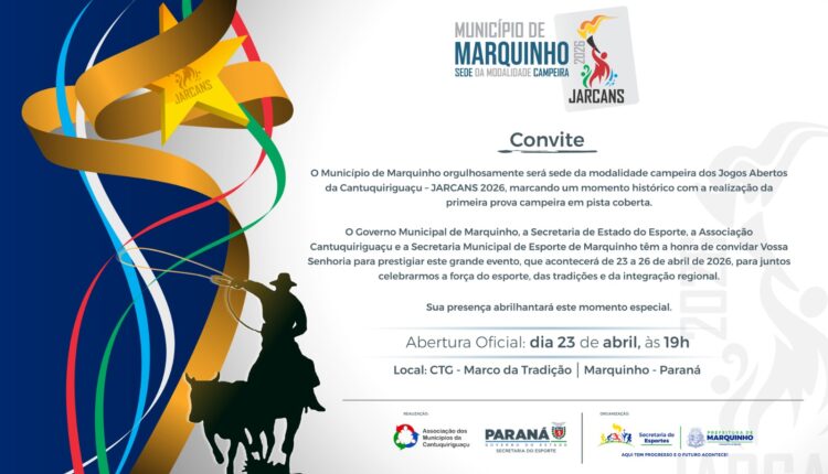 O município de Marquinho se prepara para receber, entre os dias 23 e 26 de abril de 2026, a modalidade campeira dos Jogos Abertos da Cantuquiriguaçu, o ‘Jarcan’s’. A edição será marcada por um feito inédito na história da competição: a realização da primeira prova campeira em pista coberta.