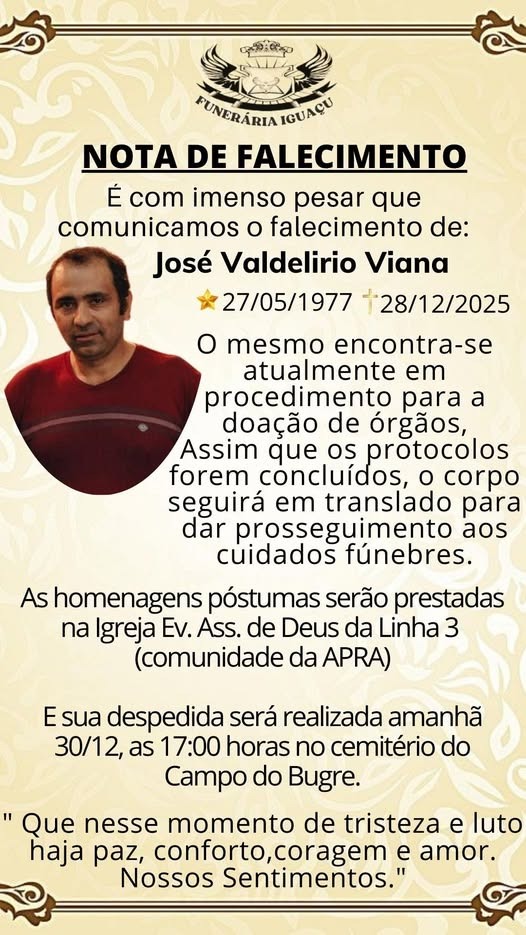 Seu corpo está sendo velado na Igreja Evangélica Assembleia de Deus da Linha 3 e seu sepultamento será amanhã (30), às 17 horas, no Cemitério do Campo Bugre.