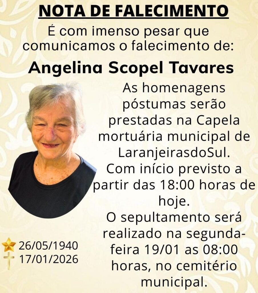 Nota de falecimento Nota de falecimento On 18 jan, 2026 Foto: Reprodução Share D. Angelina faleceu aos 85 anos Aos amigos e familiares, nossas condolências. jcorreioJornal Correio do povojornalismoLaranjeiras do SulNota de falecimentoNotíciasParanáúltimas notícias Share
