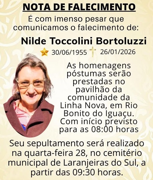 Nota de falecimento Nota de falecimento On 27 jan, 2026 Foto: Reprodução Share Sra. Nilde faleceu aos 70 anos Aos amigos e familiares, nossas condolências. jcorreioJornal Correio do povojornalismoLaranjeiras do SulNota de falecimentoNotíciasParanáúltimas notícias Share