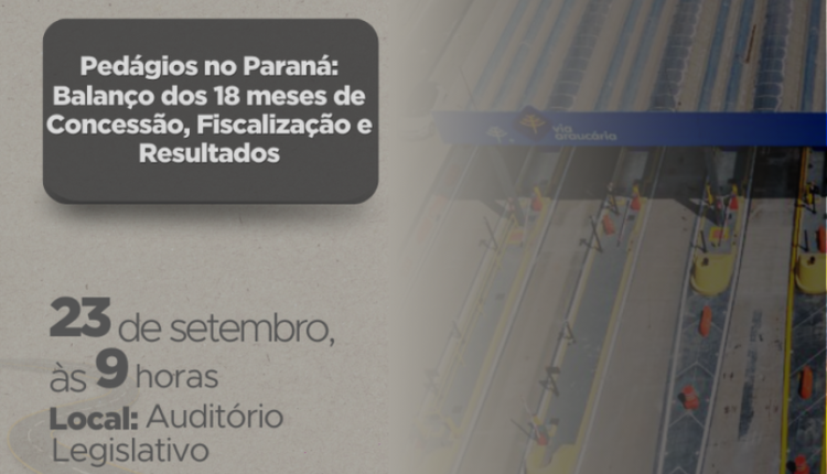 O deputado Luiz Cláudio Romanelli (PSD), presidente da Frente Parlamentar Municipalista, convida a todos os interessados para a audiência pública ‘Pedágios Paraná: Balanço dos 18 Meses de Concessão – Fiscalização e Resultados’, na próxima terça-feira (23), a partir das 9 horas, na Assembleia Legislativa. “Nesta audiência a FIEP vai apresentar os resultados da fiscalização do Observatório dos Pedágios, uma plataforma digital de monitoramento das obras, cronogramas e tarifas dos novos contratos de concessão. “Este será um momento fundamental para avaliarmos os resultados, ampliarmos o debate e fortalecermos o acompanhamento social sobre as metas assumidas”, destaca Romanelli.