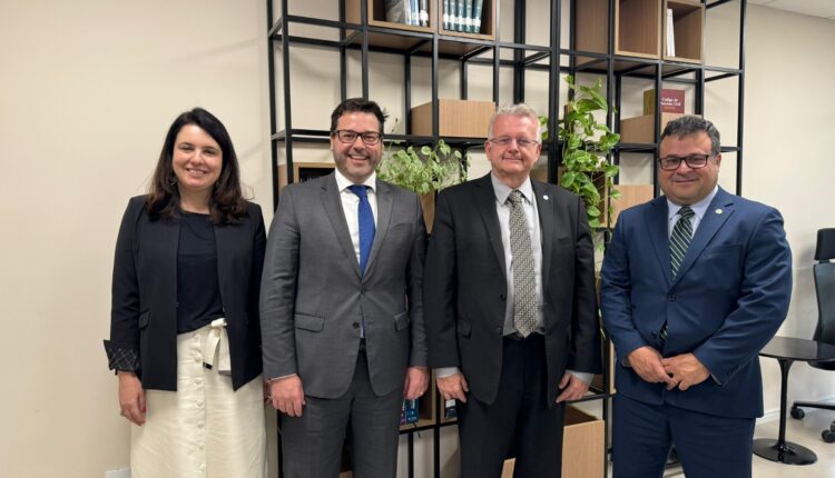 O diretor jurídico da Itaipu Binacional, Luiz Fernando Delazari, recebeu nessa quinta-feira (15) o presidente do Tribunal Regional Eleitoral do Paraná (TRE-PR), desembargador Sigurd Roberto Bengtsson, e o juiz eleitoral da 46ª Zona Eleitoral – Foz do Iguaçu, José Rodrigo Sade, no Centro Executivo da Itaipu.