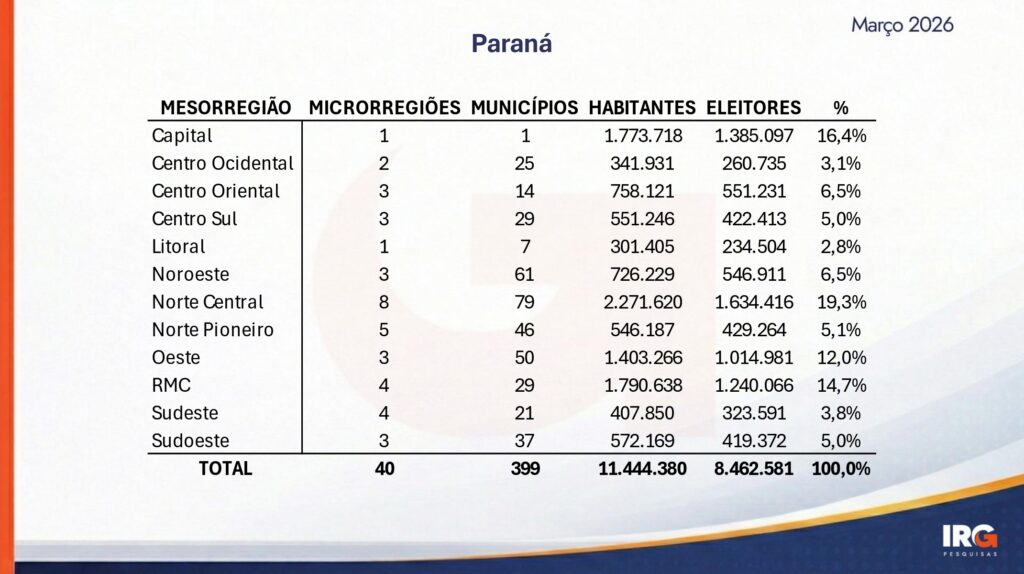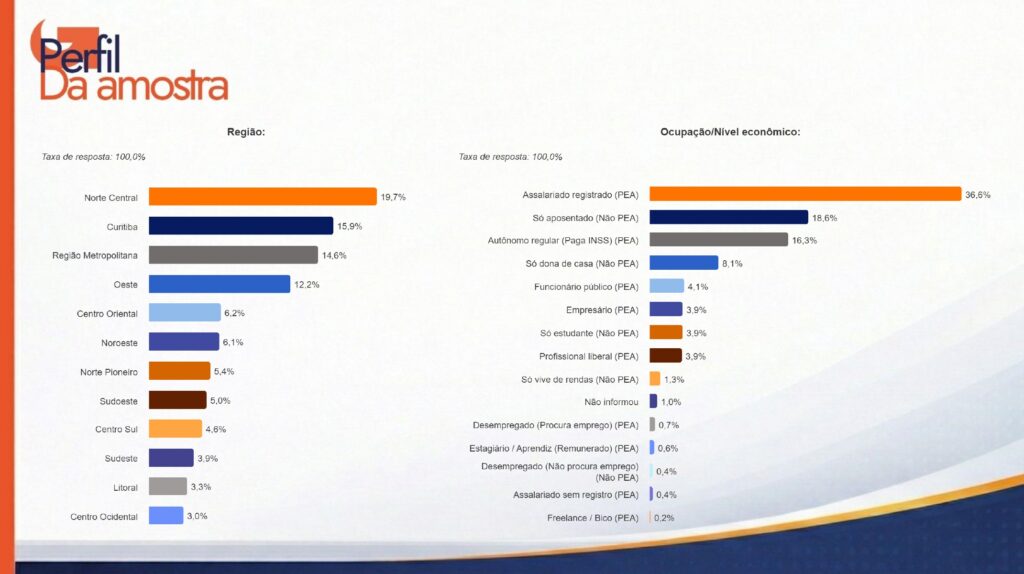 O levantamento ouviu 1.000 eleitores de todas as regiões do Paraná, por telefone, entre os dias 25 e 30 de março. A margem de erro é de 3,2 pontos percentuais para mais ou para menos, com nível de confiança de 95%.