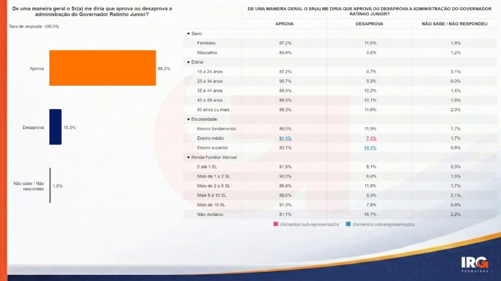 A aprovação é de 87,2% entre mulheres e 89,4% entre homens. Por faixa etária, eleitores de 25 a 34 anos registram 90,7% de aprovação. Entre 35 e 44 anos, o índice é de 88,4%, e de 45 a 59 anos, 88,3%. Eleitores de 16 a 24 anos apresentam 87,2%, e aqueles com 60 anos ou mais, 86,3%.