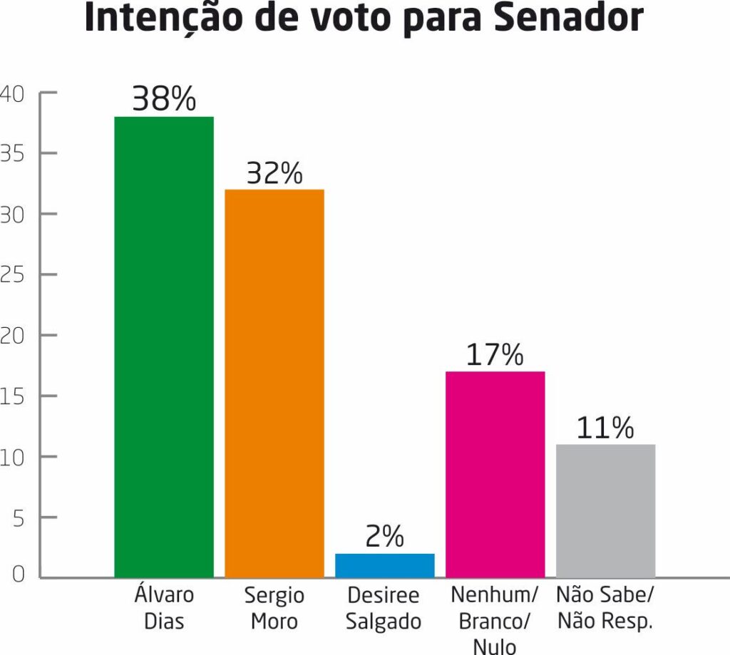O Senador Alvaro Dias permanece em primeiro lugar na preferência dos paranaenses, com 32% das intenções de votos, um aumento em relação à pesquisa anterior. Em segundo lugar está o ex-juiz Sergio Moro com 29%. Paulo Martins em terceiro, com 5% das intenções de votos, seguido de Orlando Pessuti e Guto Silva, ambos com 3%. Desiree Salgado foi escolhida por apenas 1% dos entrevistados e os outros candidatos não pontuaram.