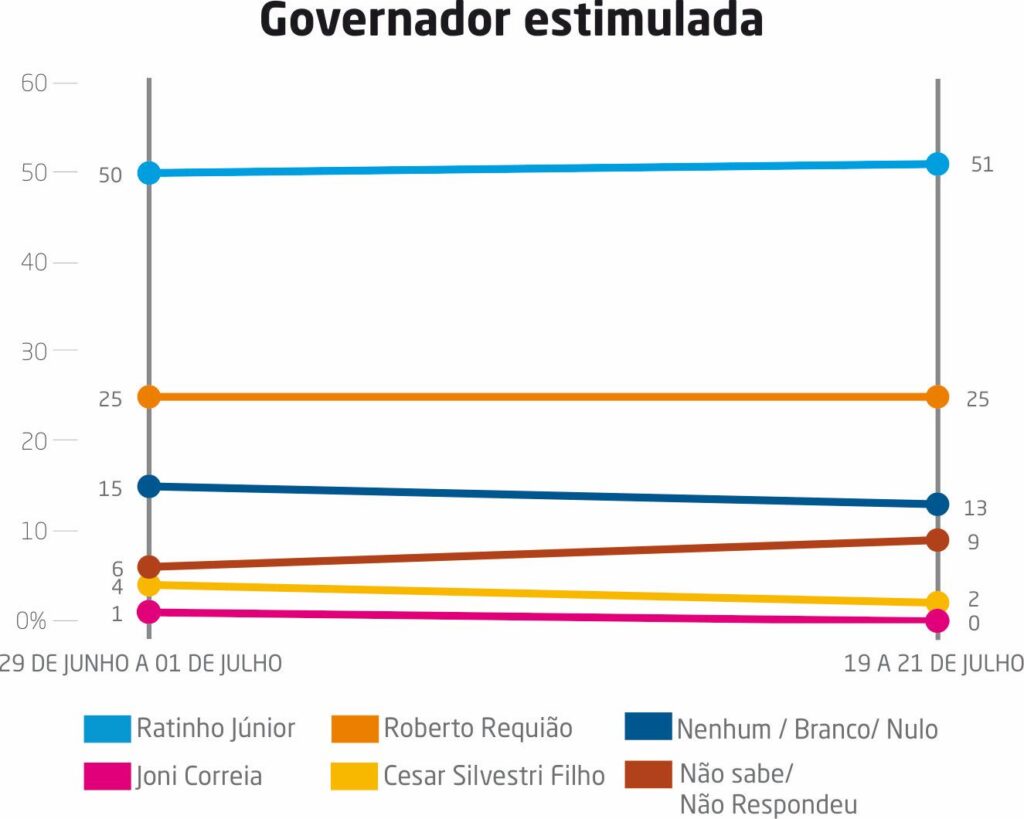 Para o governo do Paraná, a disputa está entre o atual governador Ratinho Junior e Roberto Requião. De acordo com a pesquisa, se as eleições fossem hoje, Ratinho se reelegeria em primeiro turno com 51% das intenções de voto. Requião ficou com 25%.