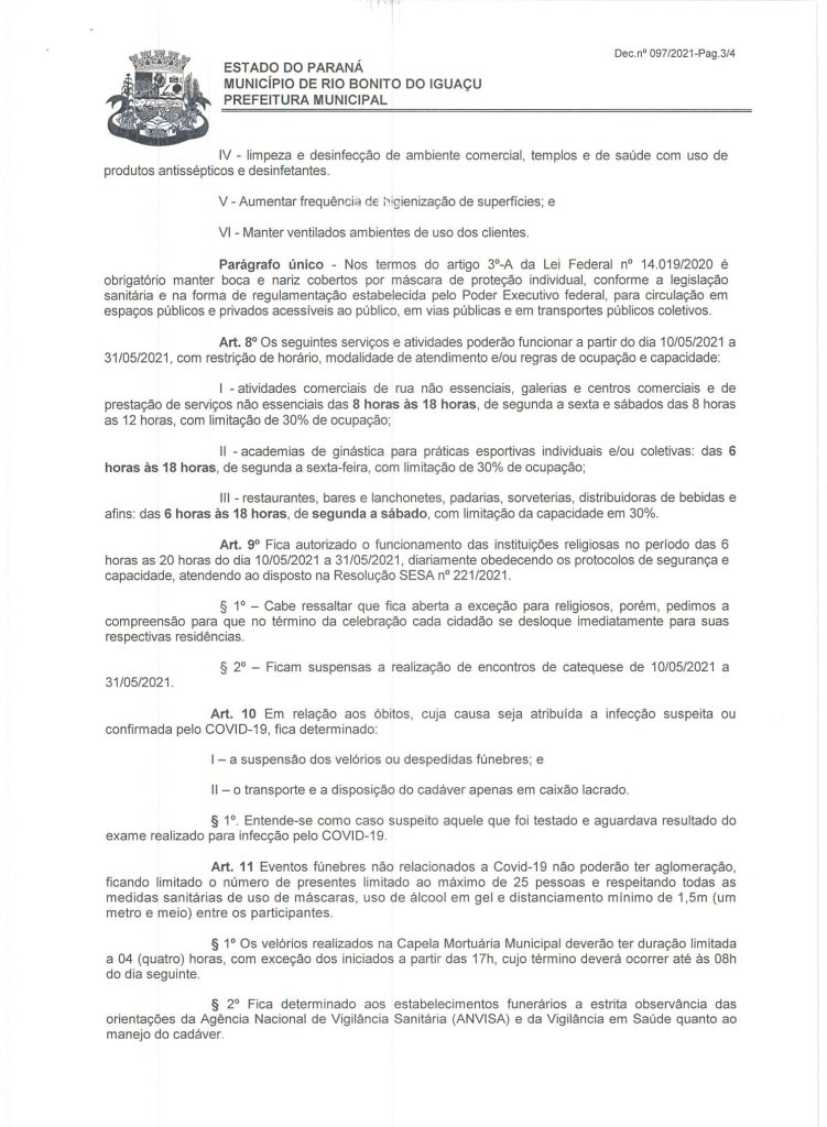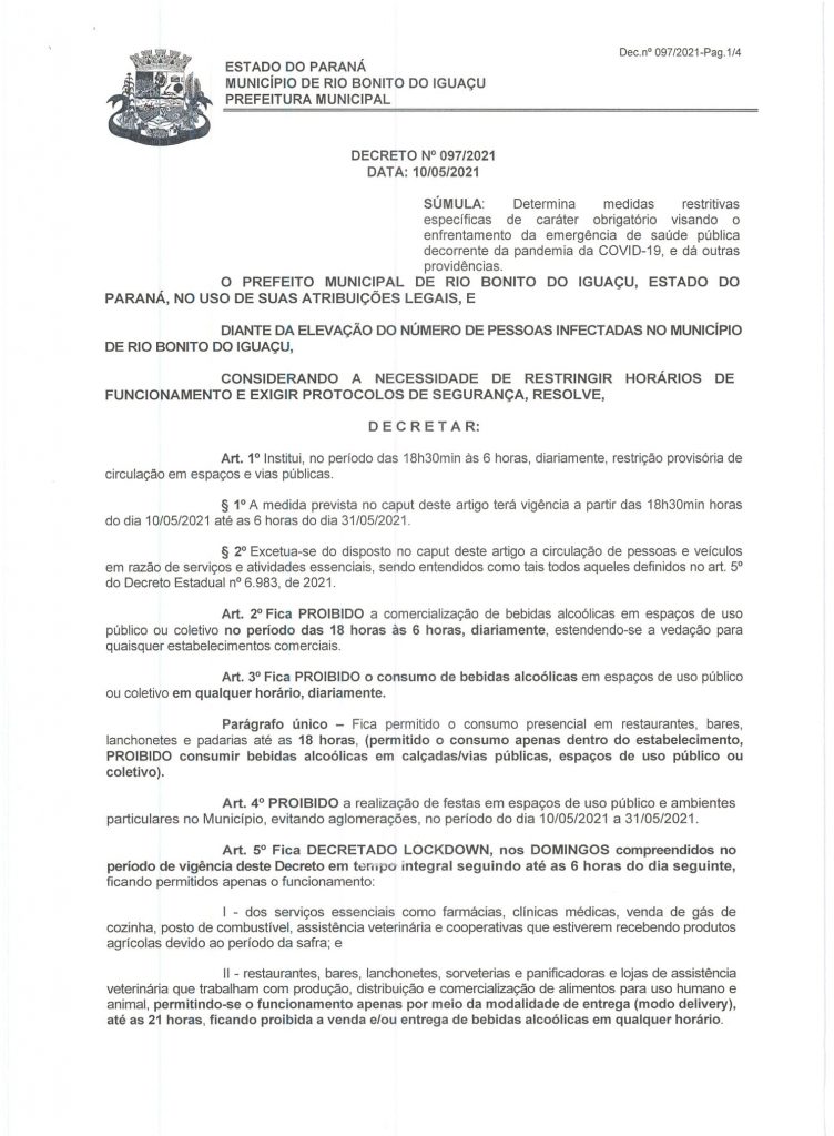 Diante da elevação do número de pessoas infectadas e visando conter o avanço do Coronavírus no Município de Rio Bonito do Iguaçu, um novo Decreto foi determinado com algumas alterações das medidas restritivas.