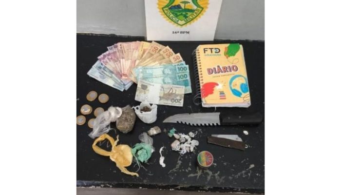 Os policiais realizaram a abordagem e a identificação dos envolvidos. Durante a revista pessoal, um dos homens foi flagrado com diferentes tipos de drogas, além de dinheiro em espécie e um caderno com anotações. Conforme a PM, o material indicaria a comercialização dos entorpecentes.