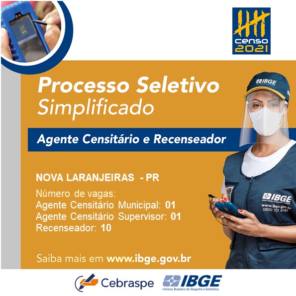 O IBGE divulgou hoje (18) dois editais de Processos Seletivos Simplificados (PSSs) para os cargos de Recenseador, Agente Censitário Municipal (ACM) e Agente Censitário Supervisor (ACS). Os aprovados nos certames serão contratados para trabalharem no Censo Demográfico 2021.