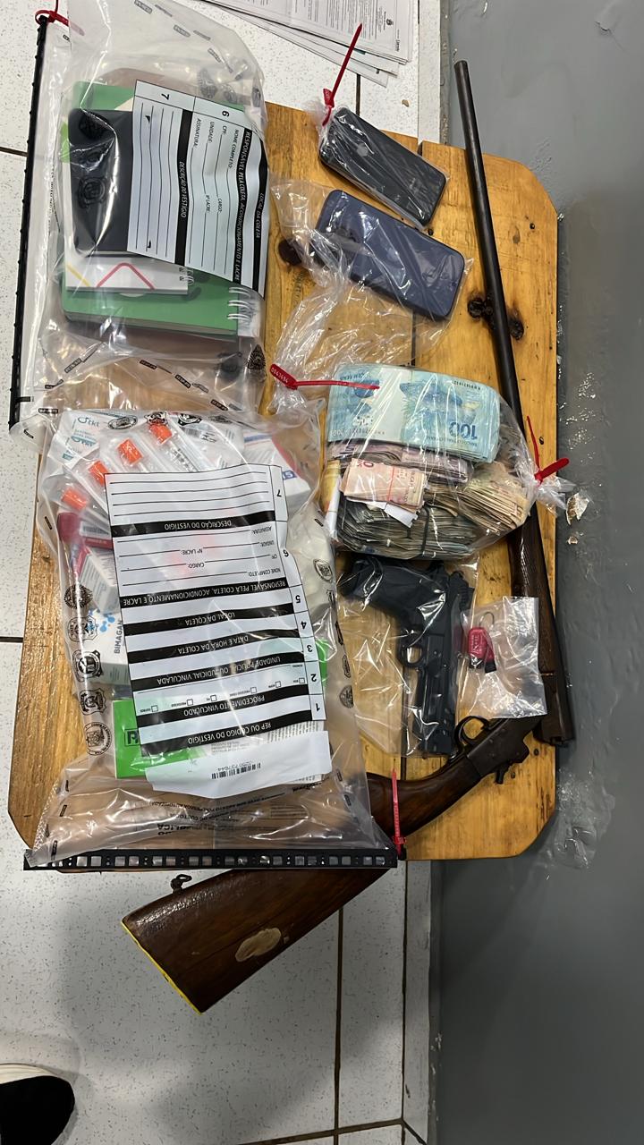 Os agentes recolheram agendas com anotações de valores e nomes, dois celulares e um simulacro de pistola.