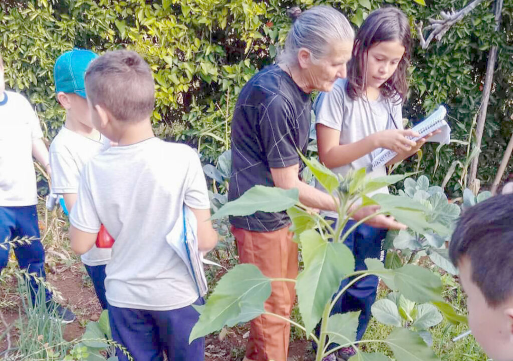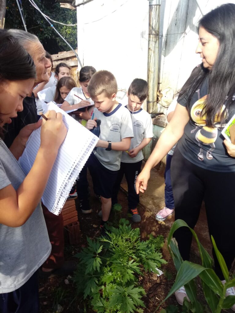 Dona Elvira, apresentou a horta para as crianças, com uma diversidade de plantas medicinais. O casal respondeu perguntas, tirando dúvidas sobre o cuidado, uso medicinal e eficácia das plantas.