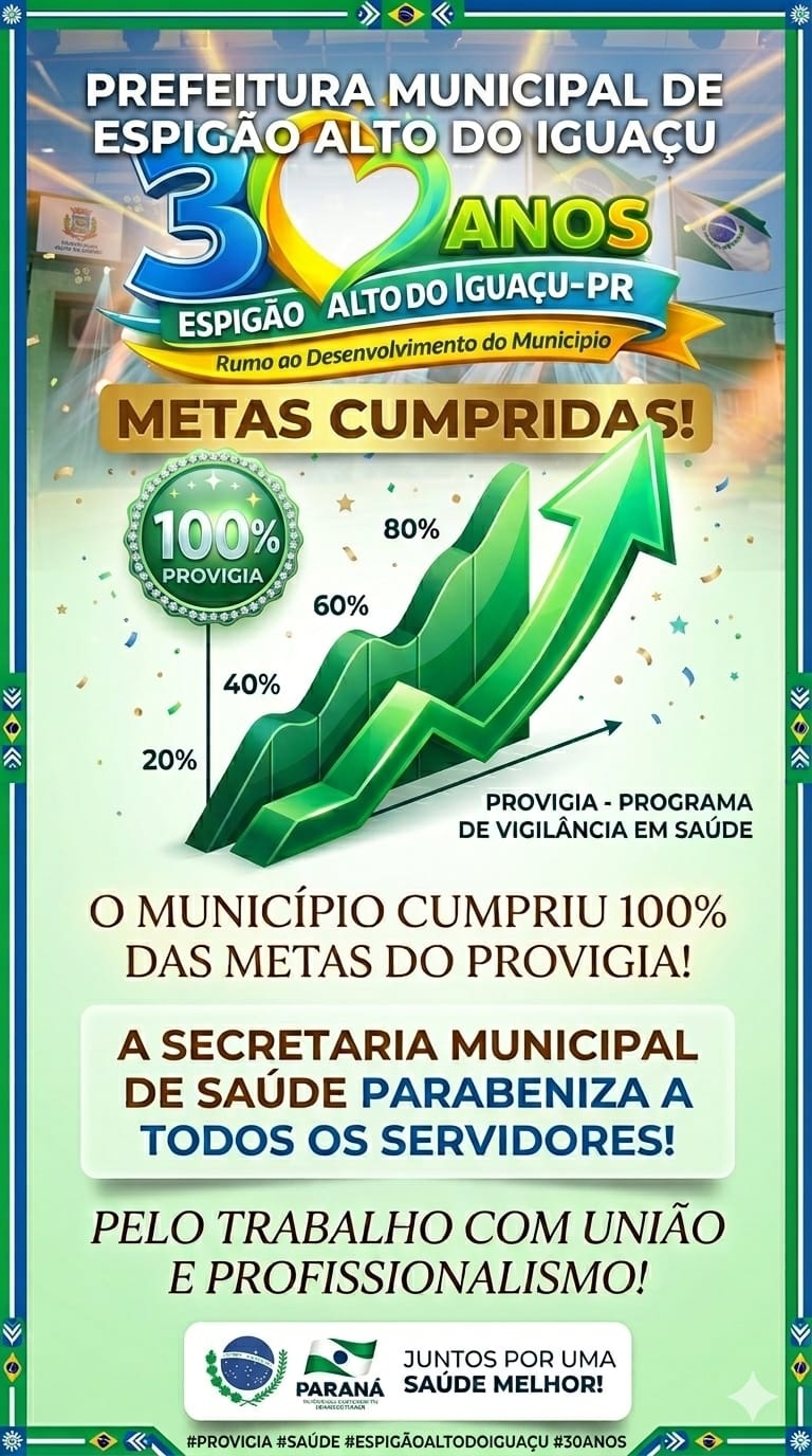 A secretaria de Saúde de Espigão Alto do Iguaçu atingiu 100% das metas do programa Provigia e conquistou a nota máxima na avaliação. O resultado reconhece o desempenho das equipes e a organização das ações de vigilância em saúde no município.