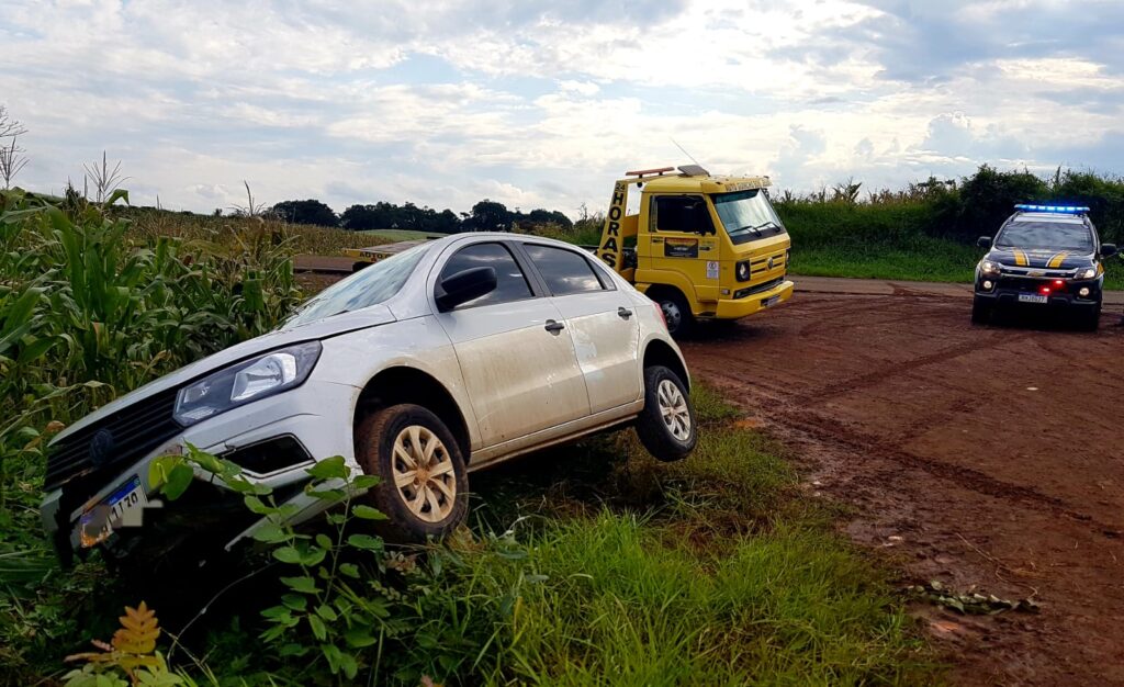 Por estar dirigindo em alta velocidade, “costurando” na pista, o motorista acabou perdendo o controle do veículo e colidiu com uma pedra ao tentar adentrar uma estrada rural. No momento a equipe avistou dois homens saindo do carro e entrando na mata, assim perdendo o contato visual do indivíduos.