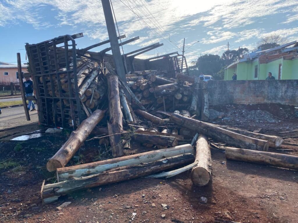 Um poste de luz foi atingido durante a queda e a Copel foi acionada para realizar a troca. O condutor do caminhão não sofreu ferimentos e foi orientado quanto aos procedimentos cabíveis.