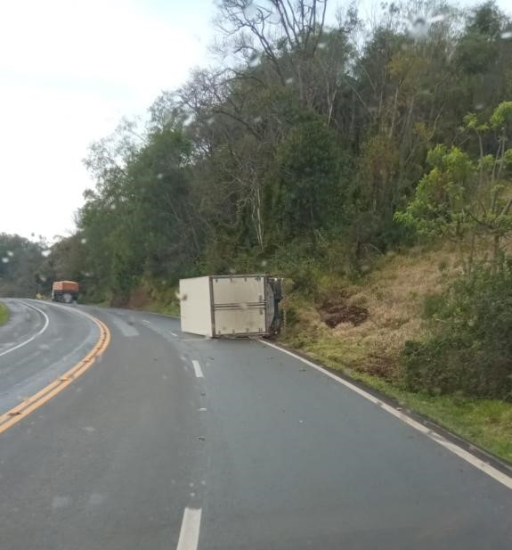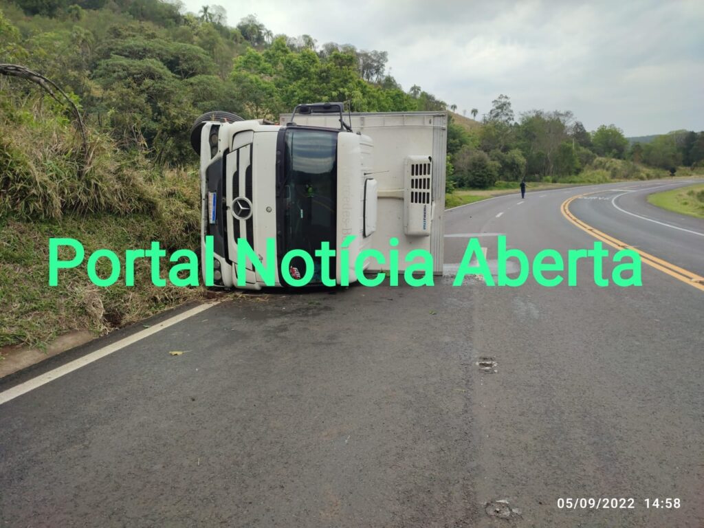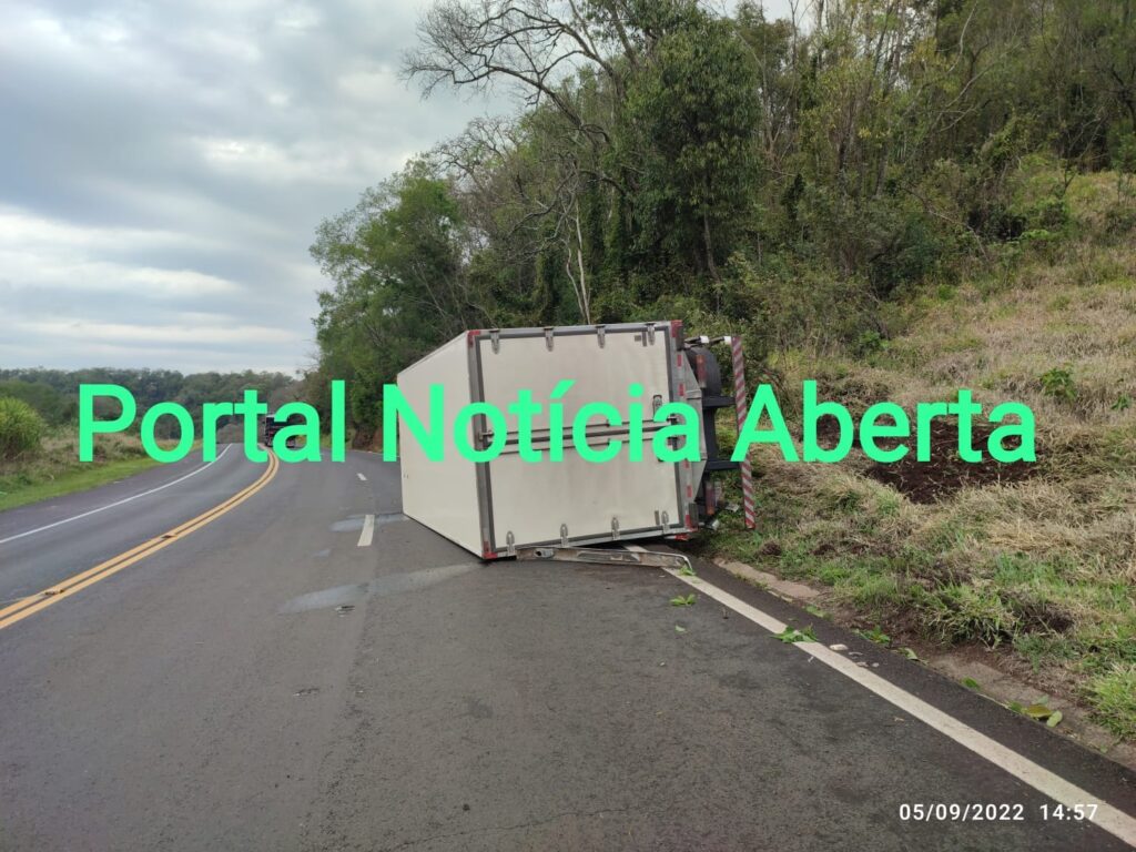 Na tarde desta segunda-feira (5), por volta das 13h30, um caminhão tombou na BR 277, Km 410, em Candói. Conforme informações, o veículo havia sido descarregado em Cascavel, e seguiria até Curitiba. Ao realizar uma curva o condutor, 26 anos, perdeu o controle do veículo que tombou sobre a pista.