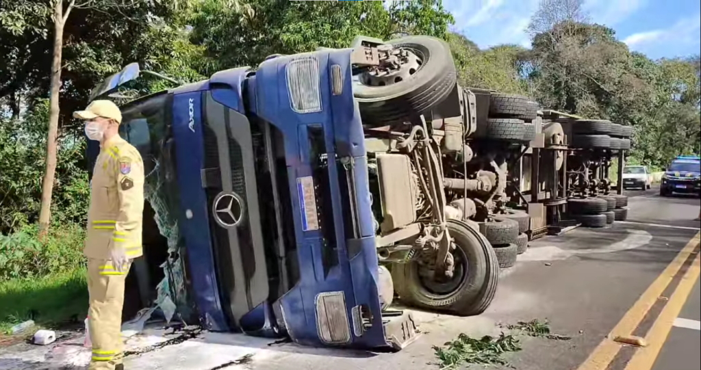 A carreta seguia pela rodovia sentido Paranaguá e teve um princípio de incêndio ao tombar por vazamento de combustível, que foi controlado por usuários da via com o uso de extintor.
