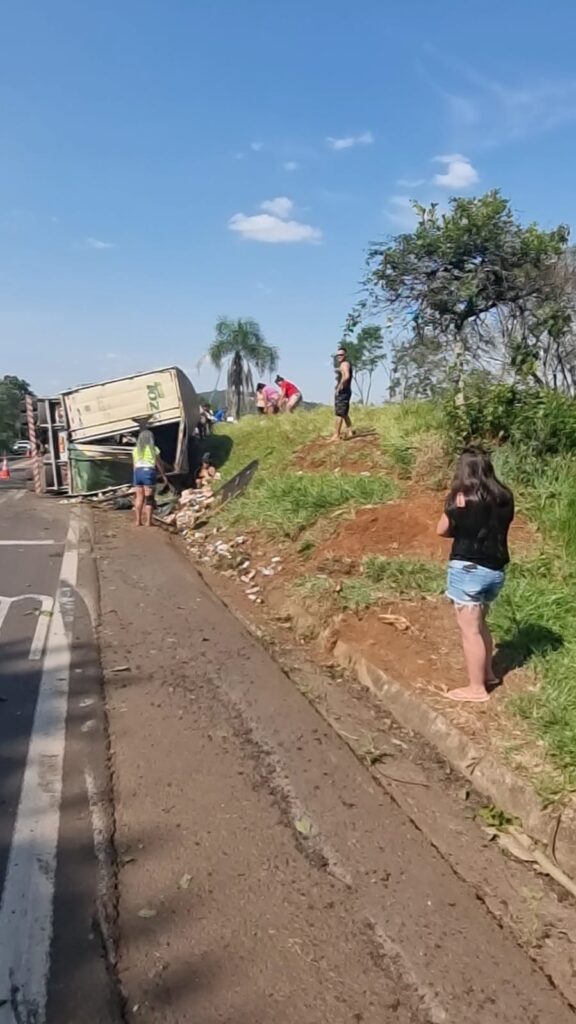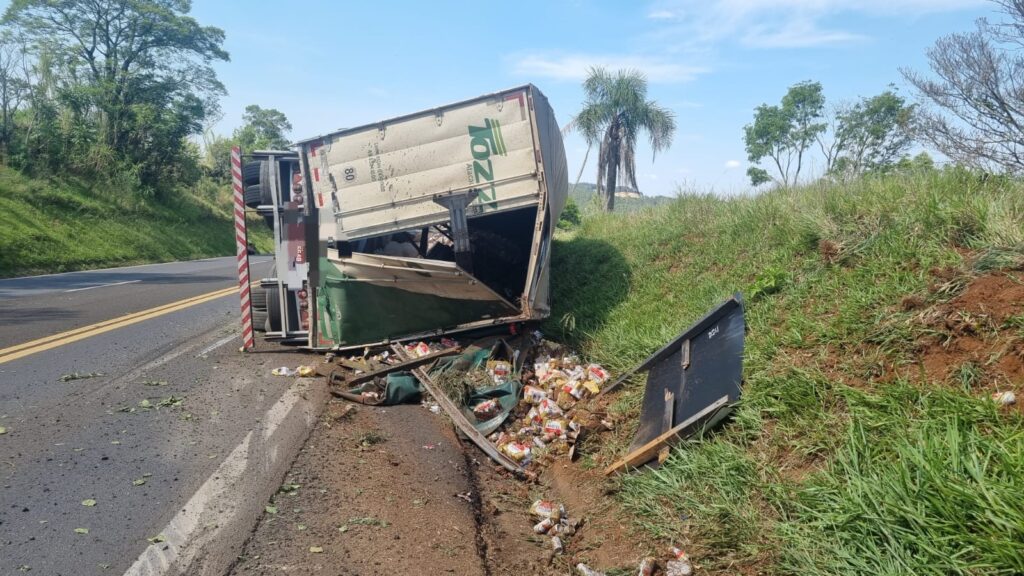 Na tarde desta quinta-feira (10) uma carreta carregada com caixas de cerveja tombou na BR 277, no KM 491, em Nova Laranjeiras.