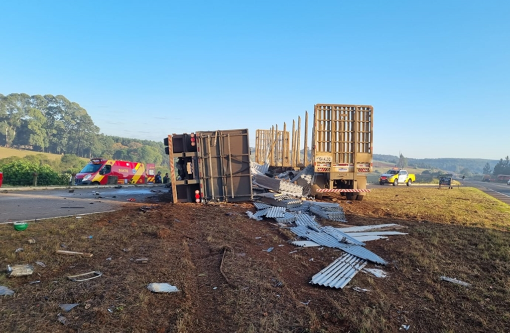 Conforme a equipe o acidente ocorreu por volta das 7h45. quando chegaram ao local encontraram os caminhões destruídos. Um deles tinha telhas de amianto como carga que se espalharam na rodovia. O outro veículo estava vazio.