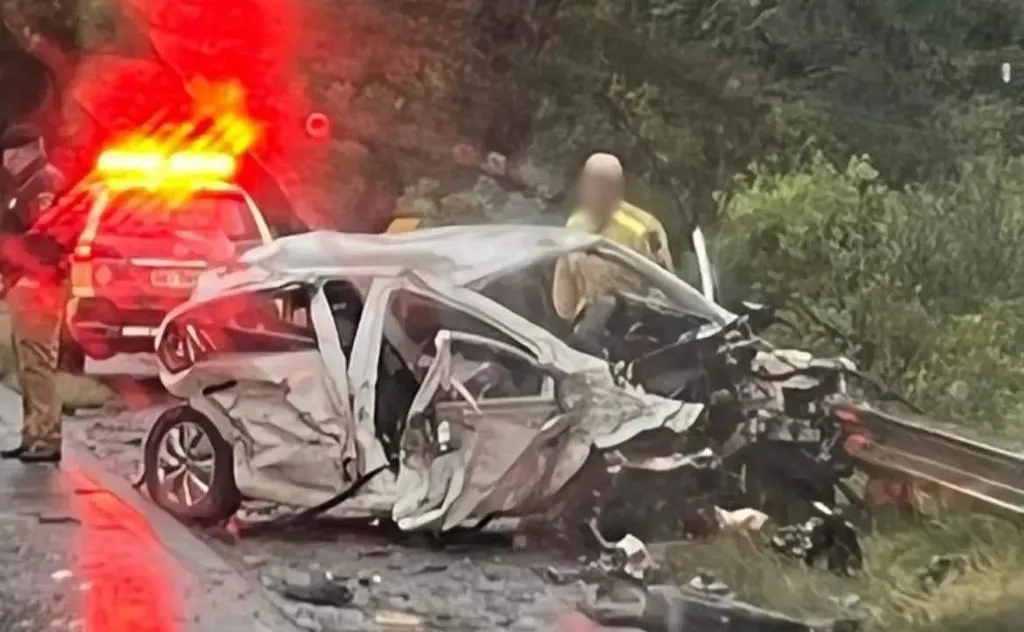 O impacto da colisão foi tão grande que o motor do carro foi arrancado. O trecho onde ocorreu o acidente é de faixa dupla, local proibido a ultrapassagem.