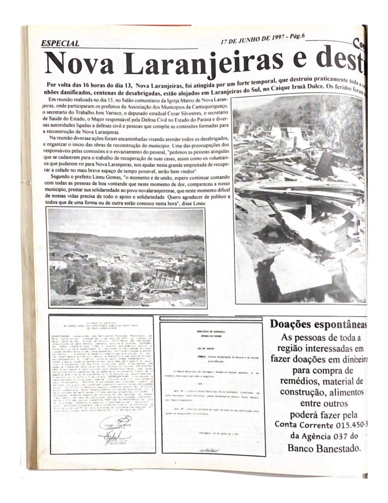Em 13 de junho de 1997 Nova Laranjeiras foi atingida por um tornado semellhante ao de hoje. Na época diversas pessoas ficaram desabrigadas. Confira a matéria publicada pelo Correio do Povo na época: